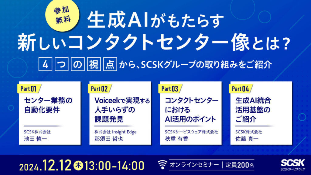 当社は、2024年12月12日(木)13:00〜14:00に開催されるSCSKグループウェビナー「生成AIがもたらす新しいコンタクトセンター像とは?4つの視点から、SCSKグループの取り組みをご紹介」において、当社のVoC分析ツール「Voiceek(ボイシーク)」を出展いたします。